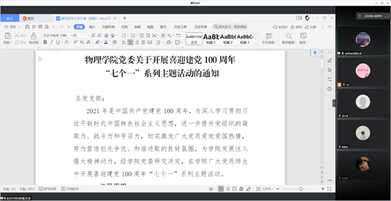 赵异肖副书记首先向各位党支部书记强调了党史学习教育活动的重要性,要求各党支部持续加强理论学习,深入学习十九届五中全会精神、学校第十三次党代会精神,做到理论武装大脑、思想指导实践。之后,赵老师传达了近期学生党建工作要点:新学期内,各党支部要针对转入支部的辅导员、对接支部的党委委员,做好组织生活的组织和记录;各党支部要梳理好各发展阶段对象的档案,把政治标准放在首位,确保发展过程的规范性,提高发展党员质量;时值建党一百周年,根据学校及学院相关主题活动的通知,提醒各支部提前进行支部内活动的规划,在完成支部特色品牌活动的立项工作,积极组织开展活动。之后张丽玫将最近需要完成的工作向党支部书记进行了详细说明。