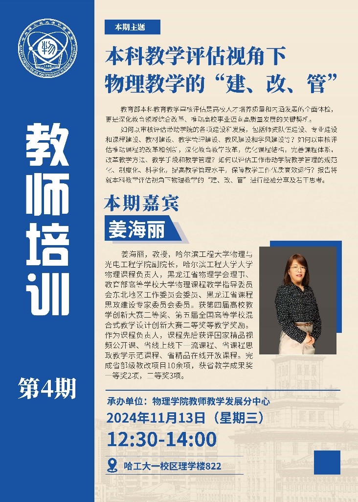 欧冠联赛官网教师发展分中心于202411131230在理学楼822举办了教师培训讲座。本次讲座由周可雅教授主持,特邀哈尔滨工程大学姜海丽教授,做了题名为“本科教学评估视角下物理教学的“建、改、管””的报告。