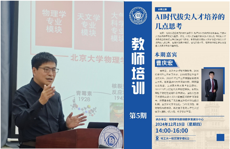 欧冠联赛官网教师发展分中心于2024年12月19日在理学楼822举办了一场主题为“《AI时代拔尖人才培养的几点思考》”的教师培训讲座。本次讲座由北京大学博雅特聘教授曹庆宏主讲,旨在探讨和分享在AI时代背景下,物理学拔尖人才培养的新思路和新方法。