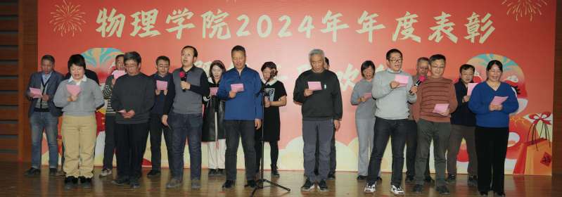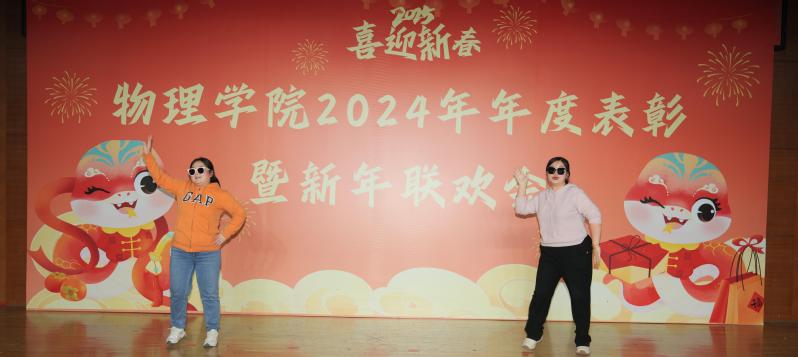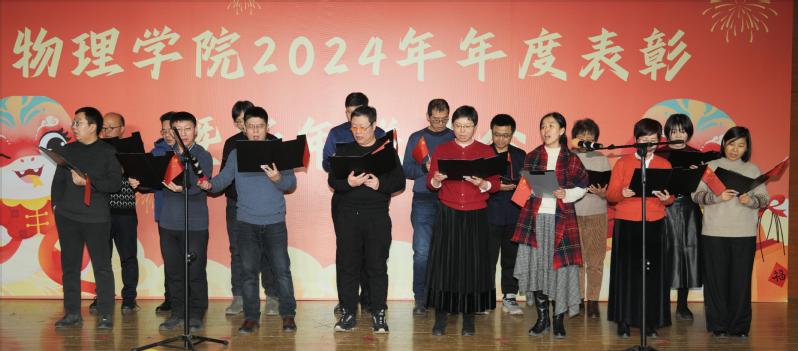互动环节中,各系、中心、办公室依次上台,献上了精心准备的节目。近代系亲子合唱《苹果香》满溢家庭温情;实验中心李俊庆老师的小提琴独奏《乌苏里船歌》悠扬悦耳;两办老师的《三句半》妙趣横生;实验中心合唱《中国人》激昂豪迈、自制仪器互动游戏“悬球争霸”充满挑战;大物教研中心合唱《我和我的祖国》深情款款;光电系师生合唱《奔跑》活力四射;应物系合唱《真心英雄》振奋人心;双人舞蹈《八方来财》喜气洋洋。最后,领导班子带来诗朗诵《赓续物理学科精神文化 走好新时代奋进路》。活动在欢声笑语、其乐融融的氛围中落下帷幕。