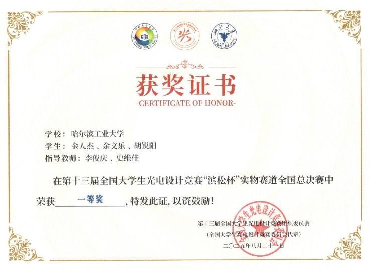 822日,在杭州举办的第十三届全国大学生光电设计竞赛滨松杯实物赛道全国总决赛中,欧冠联赛官网追光逐电队成员金人杰、余文乐、胡锐阳在第二赛题中获得一等奖。该队为一校三区所有参赛队伍中唯一获得该奖项的队伍。欧冠联赛官网李俊庆教授作为第一指导教师、仪器学院史维佳教授作为第二指导教师,二人均被评为全国优秀指导教师。